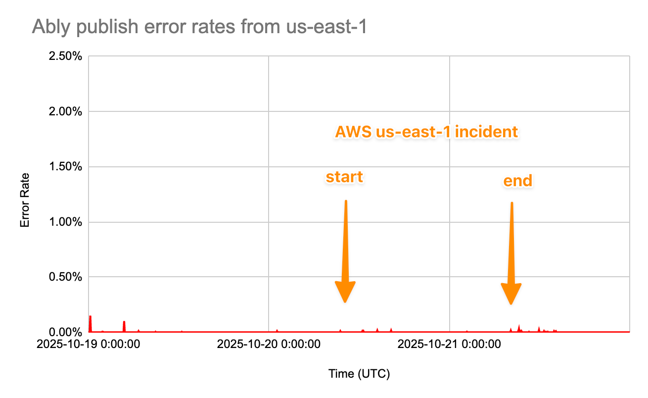 During this week’s AWS us-east-1 outage, Ably maintained full service continuity with no customer impact. This was our multi-region architecture working exactly as designed; error rates were negligibly low and unchanged throughout. Any additional round trip latency was limited to 12ms, which is below the typical variance in any client-to-endpoint connection, and well below our 40–50ms global median; this is imperceptible to users and below monitoring thresholds. There were no user reports of issues. Taken together this means there was zero service disruption.