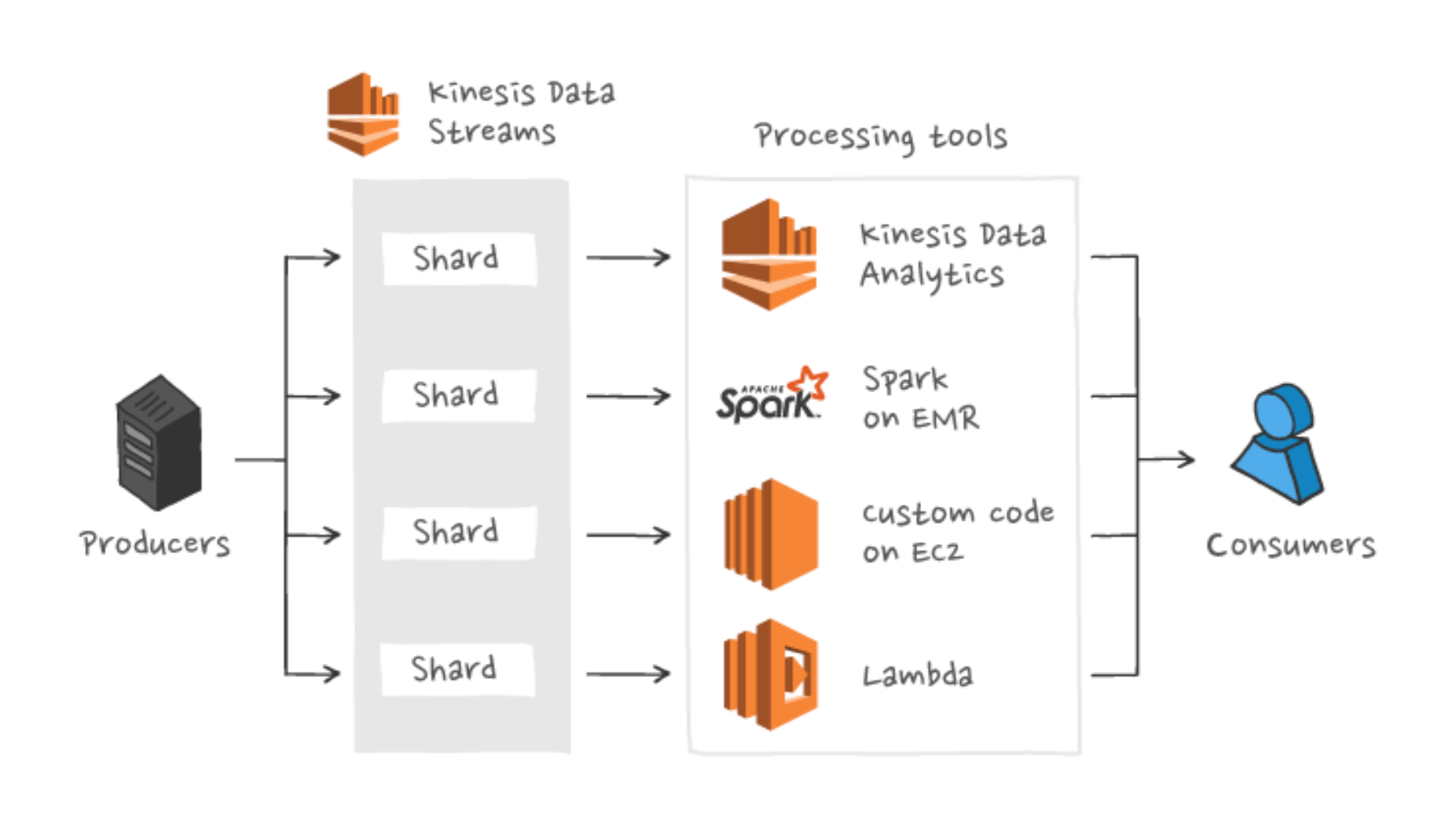 Kinesis streams are divided into ordered shards. A shard is a horizontal partition of data in a database, where each shard is placed on a separate database server instance in order to spread the load. Producers produce data, called records, and stream it to Kinesis, where it is divided into a shard. Consumers can then make use of the streamed data. By default, the data retention in Kinesis is 24 hours but can be changed to 7 days. Multiple apps can consume the same stream.
