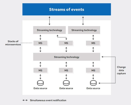 Microservices: Before the mid 2000s, most applications were built as monoliths – meaning an entire application was housed as one unit. Due to innovation from companies like Amazon and Netflix, microservices architecture emerged as another option. This architecture design separates and isolates components, turning them into services connected by APIs. In this context, EDA – particularly event streaming – can be a helpful supporting element because it enables faster, more reliable communication between services.