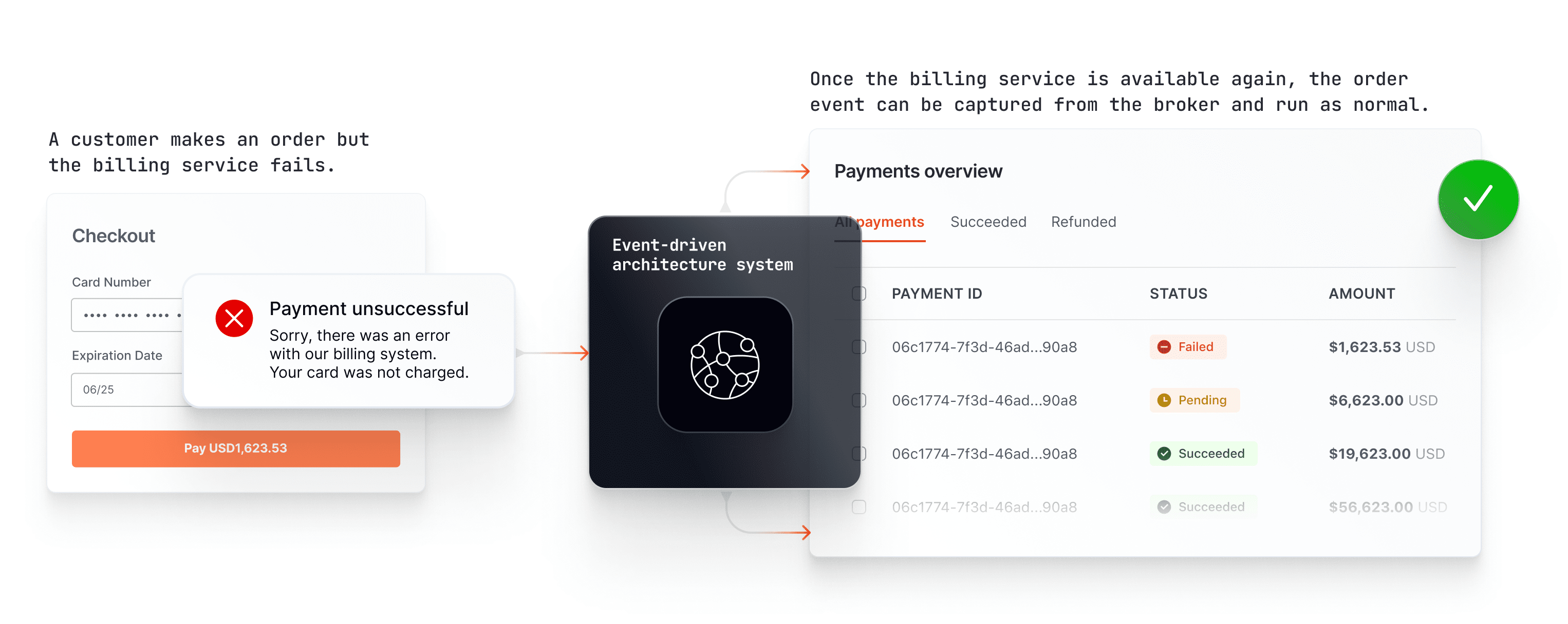 As soon as the payment fails, an event streaming platform like Kafka can capture the event, process it, and add a success/failure response to an event queue. The system can then capture the success events and commit them to a database. Meanwhile, failure events can flow through a platform like Ably so they can be broadcasted to customers.
