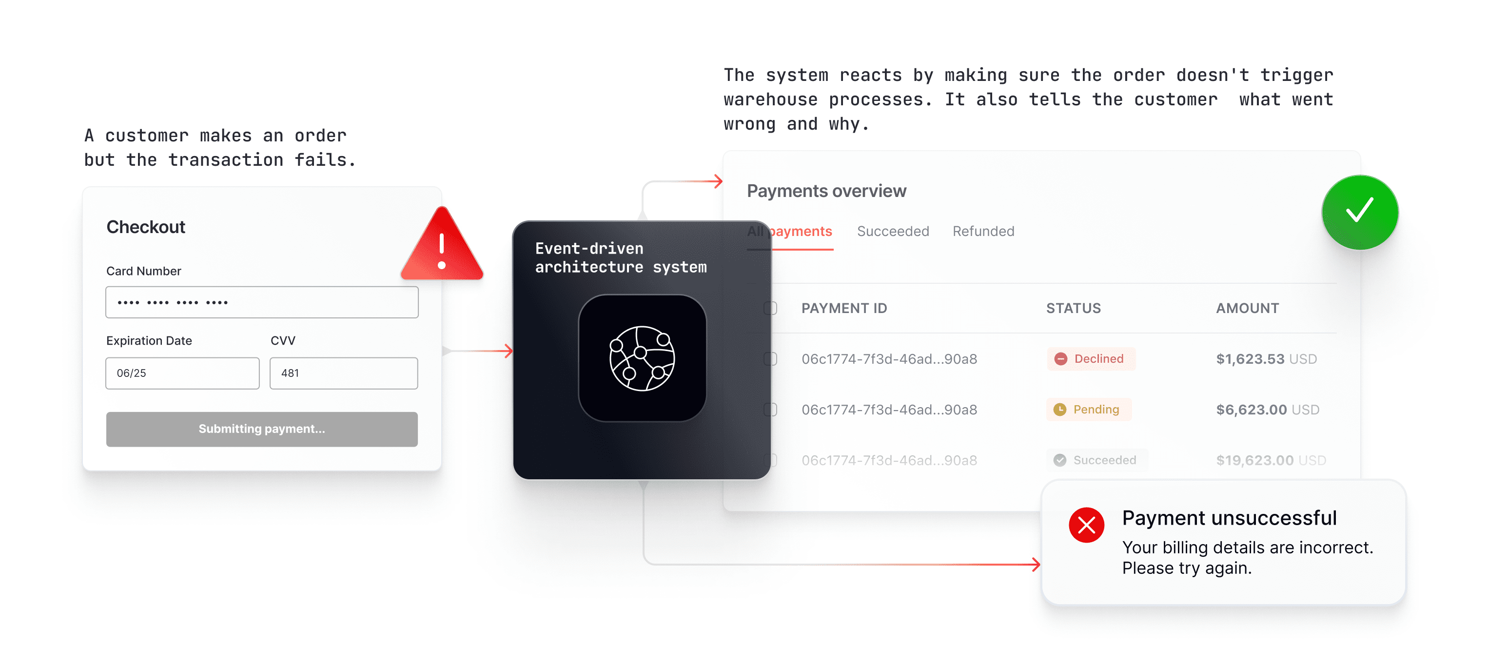 With EDA, companies can connect their internal event-driven systems to customer-facing update functions. If a payment fails, the system can react by making sure the order doesn’t trigger fulfillment or inventory processes, and the system can ensure the customer instantly knows what went wrong and why.
