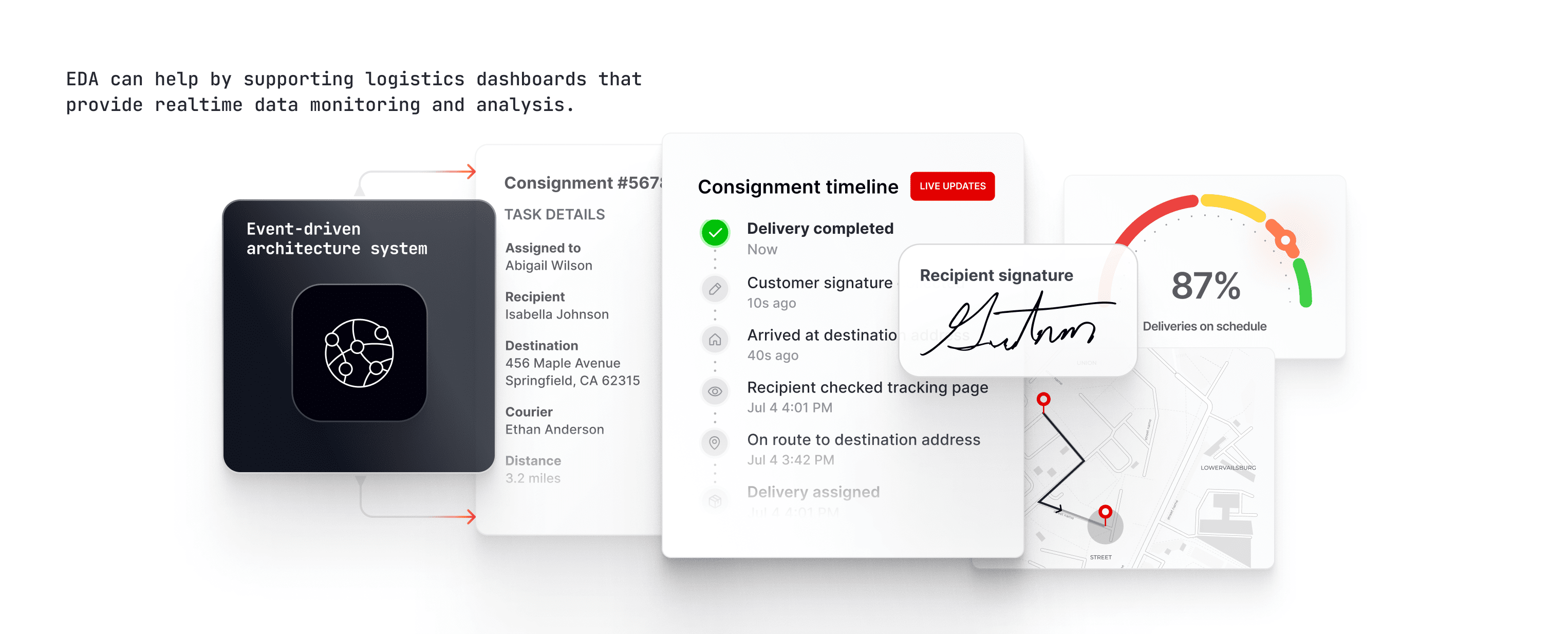 EDA can help by supporting dashboards that provide realtime data monitoring and analysis. With these dashboards, logistics companies can keep a closer eye on the web of processes that keep packages moving. And with event streaming platforms in conjunction, these dashboards can ingest and display events as well as the contexts that produced these events.