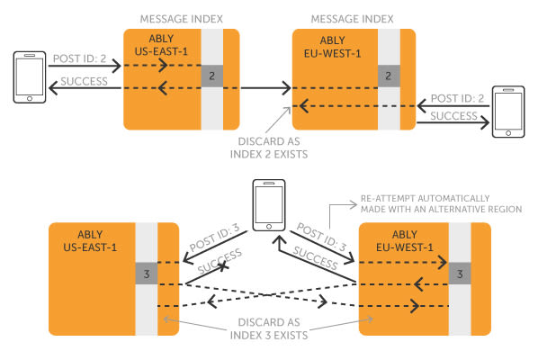There is always the possibility that a second attempt to publish a message is made against an Ably endpoint in a different region from the first attempt. In fact, in the case of Ably, this will be relatively common – because when a client library experiences a failed API request it will direct subsequent attempts to a fallback endpoint in a different region. If a first attempt in one region (A) happens to succeed but the client nonetheless reattempts in a different region (B), the message is also capable of acceptance there (since the scope of the persistent index is regional).