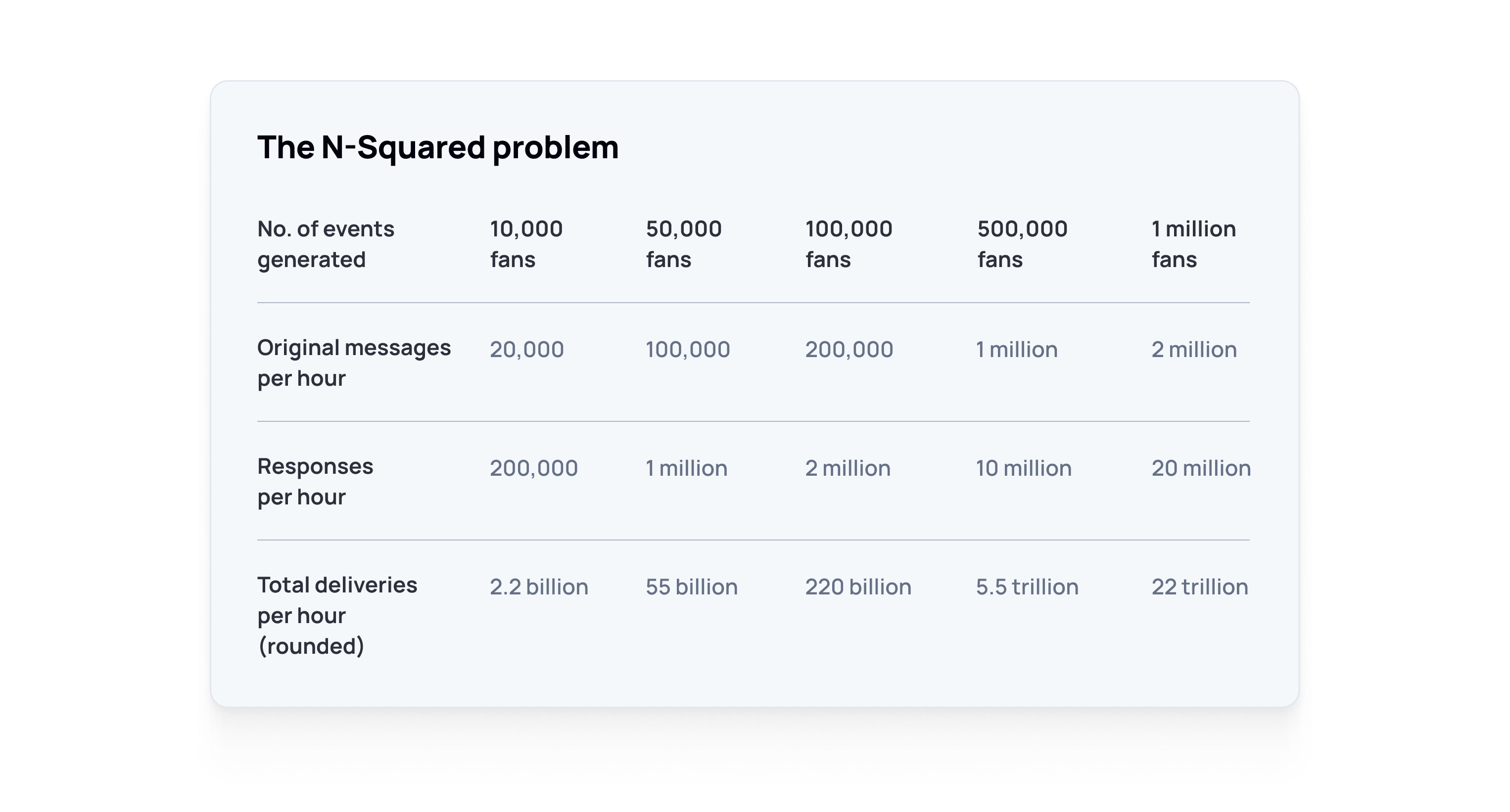 During critical moments—like a last-minute goal in football or a buzzer-beater in basketball—thousands of fans might send messages simultaneously. Ensuring these messages are delivered correctly, and only once, is a great example of the engineering challenge we’ve been looking at. That’s especially true at scale, where the n-squared problem means that each new fan interaction could generate thousands, millions, or even billions of message deliveries.