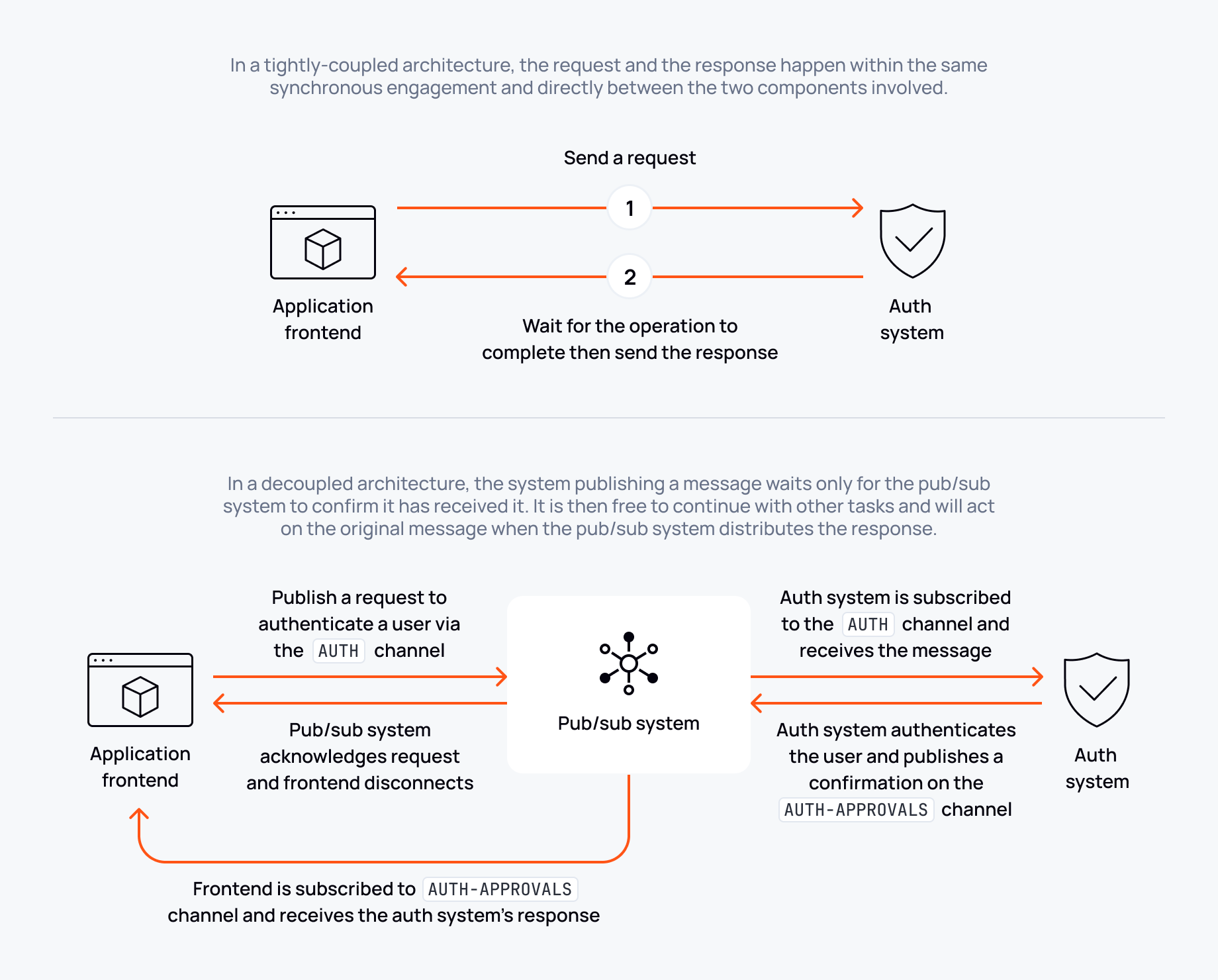 Compares tightly coupled vs. decoupled architectures in authentication systems, and how pub/sub systems enable asynchronous communication flows.