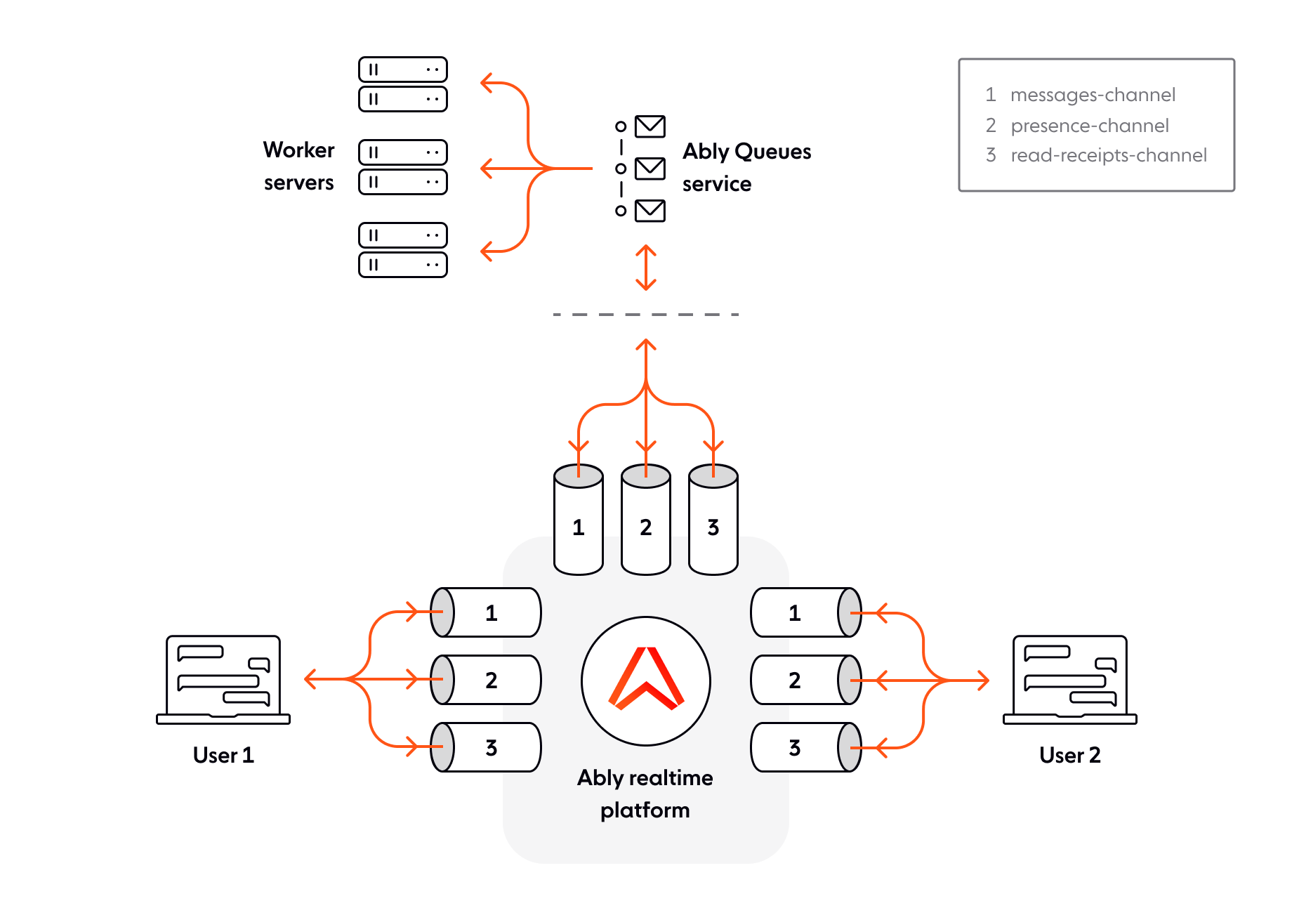 The messages channel can be used by the users to send and receive messages from other users. Hence, they need to have both publish and subscribe permissions on this channel. This messages channel can be set up to use the Ably Integrations service, so you get a buffer/ shock absorber to cope with a high volume of incoming messages. Ably Integrations is a scalable service that lets you implement load balancing on your servers, trigger events or serverless functions in realtime, and even stream data in realtime to other third-party streaming services.