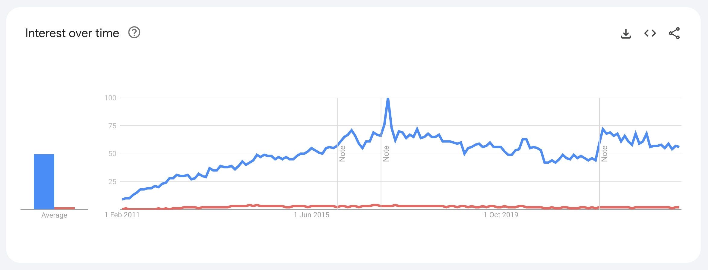 Interest (search volume) over time for Socket.IO as a search query vs SockJ as a search query.
