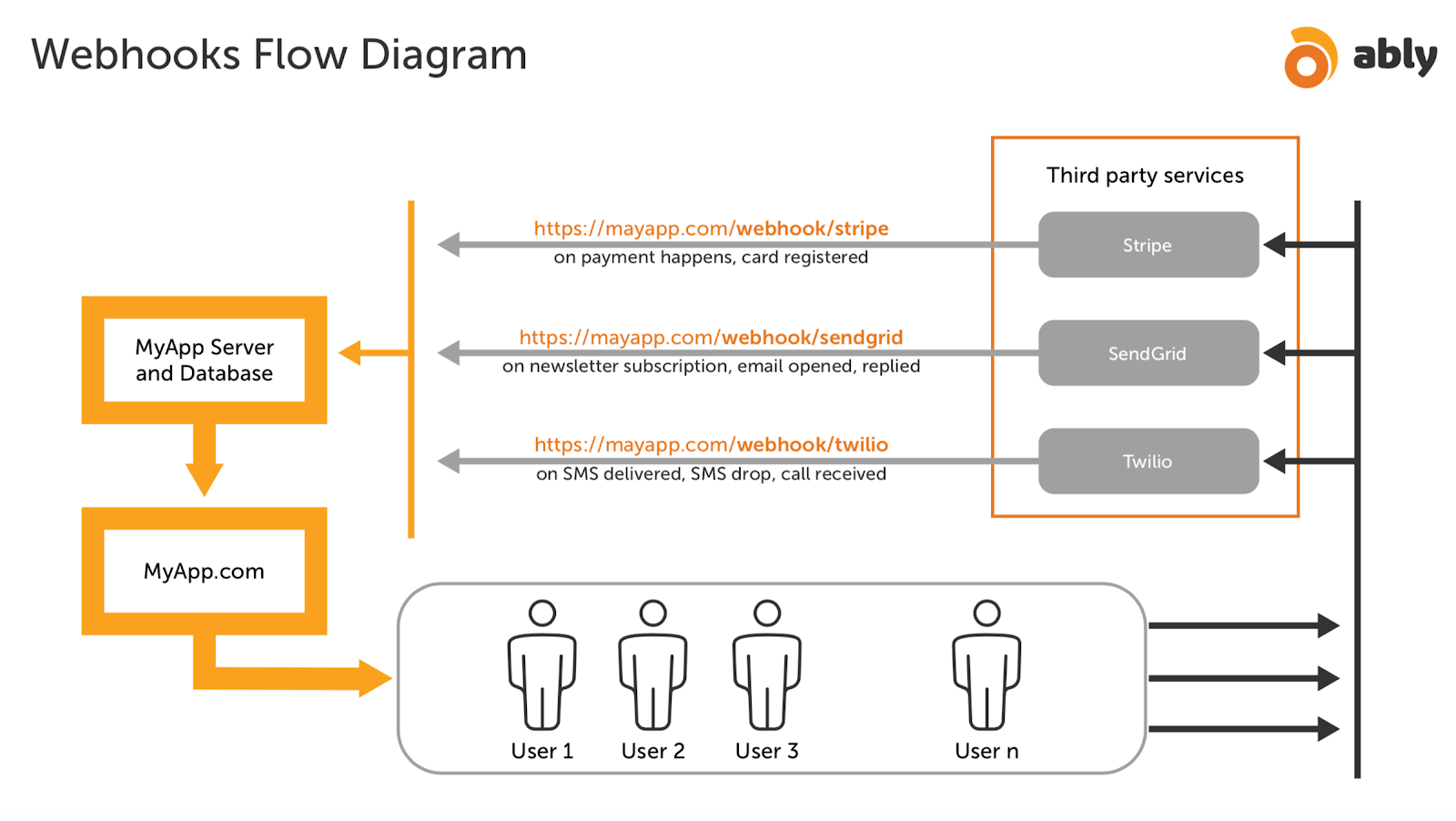 With Incoming Webhooks, one of our latest new features, you can solve all the challenges of scaling realtime data flows across multiple applications using webhooks. Just configure external services and let Ably handle the buffering and load balancing as webhook traffic scales.
